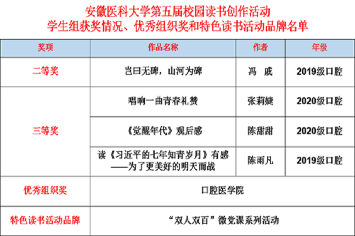 近日,学校第五届校园读书创作活动评选结果出炉,DB电竞师生教职医护员工再获佳绩,取得学生组二等奖1名、三等奖3名,教工组二等奖1名、三等奖1名、优秀奖2名的好成绩,DB电竞 荣获优秀组织奖,“双人双百”微党课系列活动获评特色读书活动品牌。