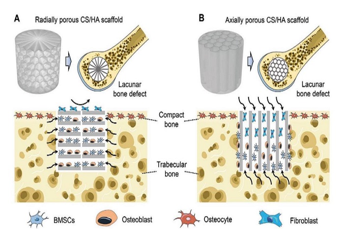 该团队研发了一种具有放射状有序多孔结构的纳米复合支架材料,采用改进的定向冷冻铸造法制备而成。该纳米复合支架材料是由天然生物大分子-壳聚糖(CS)和来自猪皮质骨的生物活性羟基磷灰石(HA)纳米颗粒组成,具有良好的生物相容性和生物功能。体外细胞试验和体内动物试验研究均表明,与单向多孔结构相比,该支架材料的放射状多孔结构在引导骨再生的同时,可以有效防止周围非成骨性细胞和纤维组织的侵袭,从而保证了骨再生的微环境。