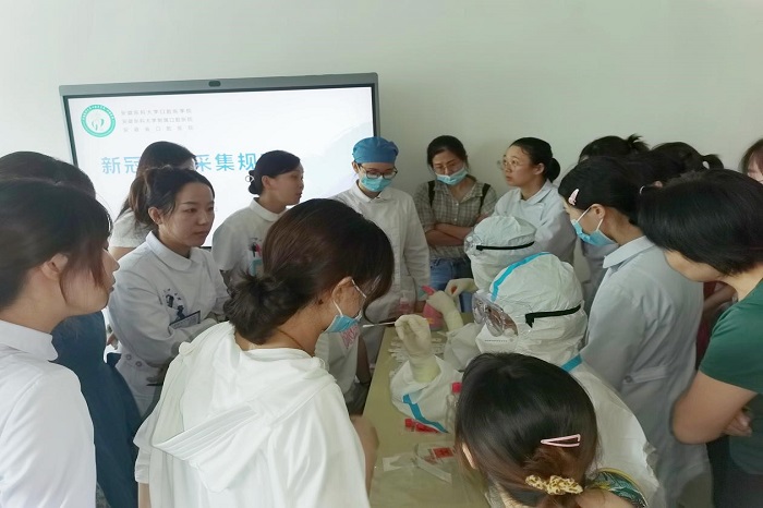 培训分成理论授课、现场演示及现场体验三部分,首先由颌面外科吕锦老师进行理论授课。她从采集鼻咽拭子时医护人员标准化防护装备,咽拭子采集时患者的体位、操作手法、采集部位、采集后标本的保存运输,以及标本采集时的注意事项进行了详细的讲解。