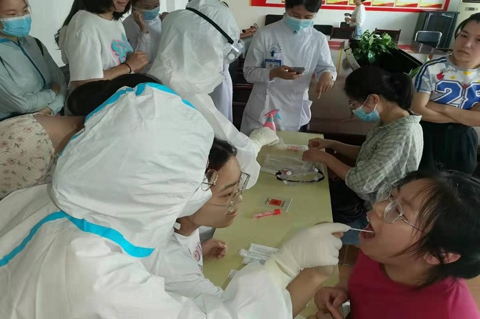 理论授课结束后,由吕锦和护理部老师统一讲解和演示口咽拭子采样技术要点、标本包装等采样工作的具体流程。随后,参加培训的老师们分为两个小组进行实操训练。每个小组有一名培训老师,指导队员两两为一组,相互进行标本采集,参训者通过亲身感受采集的过程,体会被采者的感受,从而提高自身采样准确率。并针对操作过程中如何增强被采者的配合度,提高采样速度进行了深入探讨。