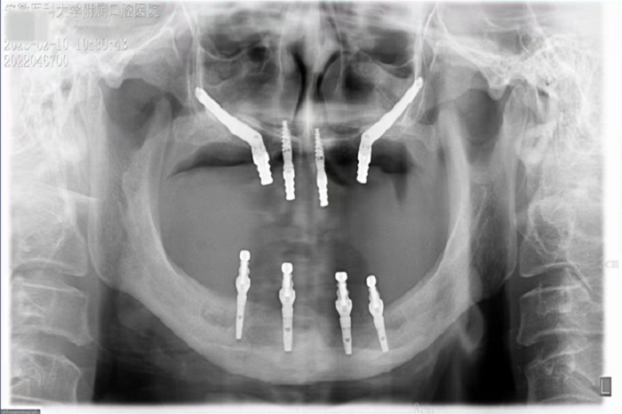 据悉,患者潘女士54岁,由于重度牙周炎导致全口牙齿缺失,严重影响面容及咀嚼功能,因颌骨严重萎缩无法进行活动义齿修复,遂来DB电竞种植科要求行上颌稳固的修复。通过检查发现潘女士上下颌骨骨量严重不足,经反复比对和考量,刘鑫主任制定了对患者上颌骨进行穿颧种植修复、下颌骨通过神经游离进行种植的方案。经过患者与家属深思熟虑后,接受了行穿颧种植术的建议。治疗组通过专业三维设计软件规划植体,口腔颌面外科和种植科专家共同完成了穿颧种植手术。患者术后第一天情况良好,无明显肿胀,精神状态佳。