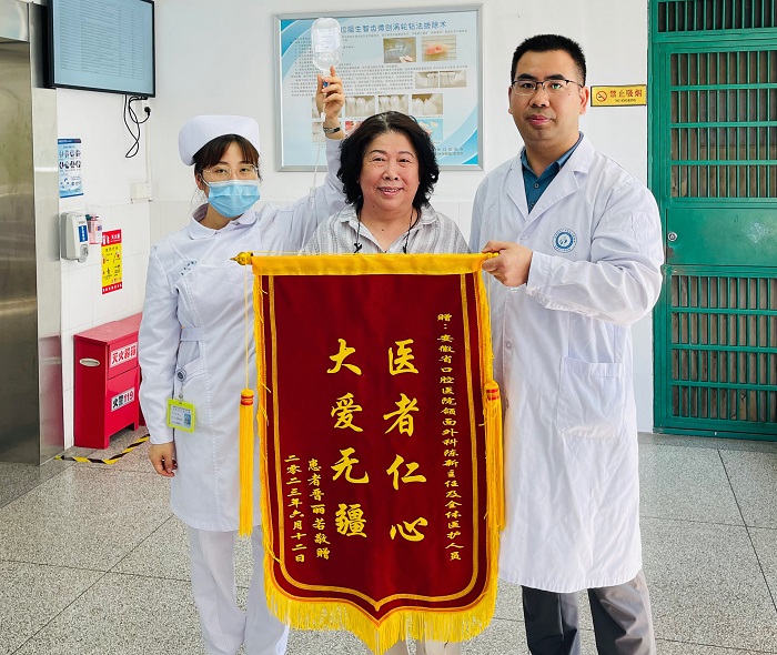 6月12日上午,DB电竞口腔颌面外科收到住院患者晋某送来的一面写着“医者仁心,大爱无疆”的锦旗,感谢陈新主任及颌面外科全体医护人员对其在住院期间的精心治疗和细心照护。