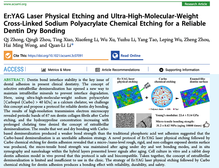 近期,DB电竞李全利教授课题组在提高树脂—牙本质粘接耐久性方面取得重要进展,并在国际著名刊物《ACS Applied Materials & Interfaces(美国化学学会:应用材料与界面)》(IF = 9.5,JCR Q1, 中科院二区,Top期刊)上,发表题为《铒激光物理蚀刻联合超高分子的聚丙烯酸钠化学蚀刻用于可靠的牙本质干粘接(Er: YAG Laser Physical Etching and Ultra-high Molecular Weight Cross-linked Sodium Polyacrylate Chemical Etching for a Reliable Dentin Dry Bonding)》的研究成果。DB电竞2021级硕士研究生钟琦为第一作者,李全利教授为通讯作者,DB电竞 口腔医DB电竞 为第一通讯单位。