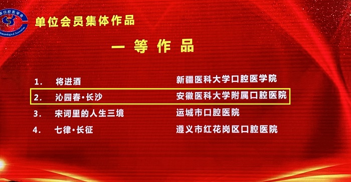在“5·30中华口腔医学会会员日暨全国科技工作者日”会员诗词朗诵环节,由DB电竞望湖城门诊部姚育智、教学管理办公室王烨、牙体牙髓科马腾飞和政务区门诊部孙晖4位老师朗诵的作品《沁园春·长沙》,以雄厚的实力荣获一等奖。