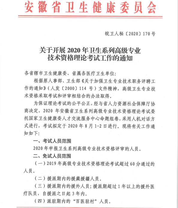 关于开展2020年卫生系列高级专业技术资格理论考试工作的通知