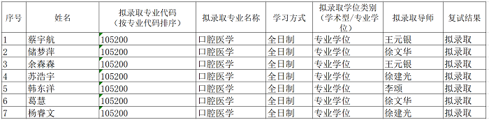 根据《关于做好我校2024年接收推荐免试生及“5+3”一体化转段生复试、录取工作的通知》(研字〔2023〕97号),口腔医DB电竞 于2023年9月30日组织开展2024年接收推荐免试硕士生复试工作,拟录取信息如下: