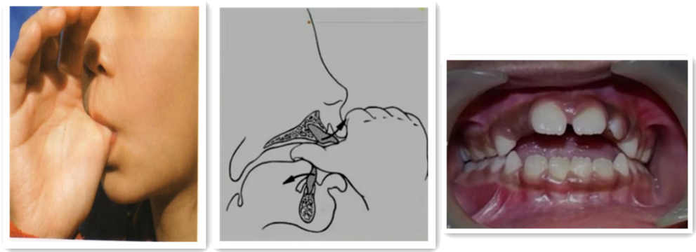 如果吮拇指时将拇指置于正在萌出的上下前牙之间,则会阻止前牙的正常萌出,造成前牙的圆形开合畸形。吮拇指时下颌骨向下移位,造成后牙的萌出过度,前牙开合;舌体处于低位而减弱了舌肌的力量,同时两侧颊肌收缩在牙弓外侧压力增加;吮指强大的力量造成口腔内气压降低,使牙弓狭窄,上前牙前突,开唇露齿,并伴有单侧后牙反合。