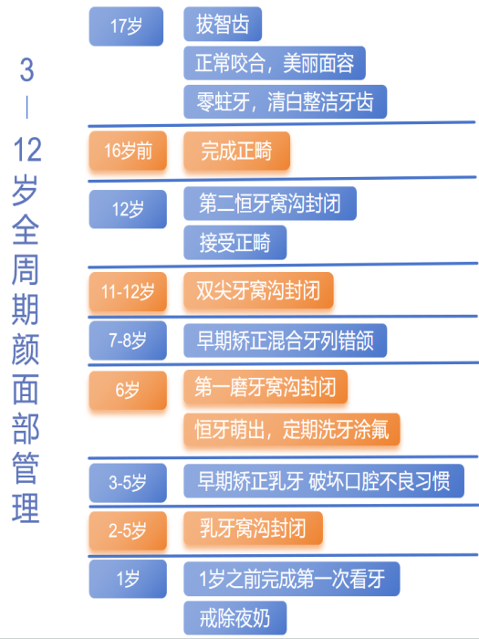 儿童3-12岁的全周期颜面发育管理是早期牙齿矫治理念的整合和升级,与传统的矫正理念不同的是将立足点放在颌骨及颜面发育上,提倡“早预防早治疗”。需要根据孩子发育的不同阶段,对颜面部生长发育进行专业的评估及全过程分段管理,主要有三大管理步骤: