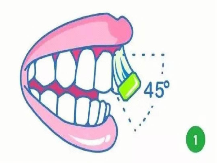 1.手持刷柄,将刷头置于牙颈部,刷毛与牙根部呈45度角,刷毛指向牙根方向(上颌牙向上,下颌牙向下),轻微加压,使刷毛部分进入龈沟,部分至于龈缘。