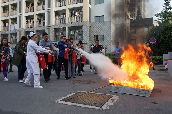 理论授课后,医院组织全院各科室代表人员在校图书馆后的安全位置,进行灭火器使用操作演练。专业人员首先详细介绍了灭火器的使用方法及注意事项,在工作人员的组织和指导下,全体演练人员分为5组,逐一操作灭火器对模拟火灾现场进行扑救演练。大家姿势标准,反应敏捷,对准着火点,集中喷射,熊熊燃烧的火盆瞬间被扑灭。通过演练,将理论知识和现场实践相结合,使大家熟练掌握了基本的消防实操技能,提高了扑救初期火灾的意识和能力。