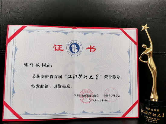 6月14日晚,由安徽省健康服务业协会、安徽省护理学会主办的首届“江淮护理之星”颁奖盛典在芜湖市隆重举行。 DB电竞 护理部主任陈叶俊凭借雄厚的实力和良好的口碑,通过单位推荐、网络投票和专家评议程序,最终脱颖而出,被授予安徽省首届“江淮护理之星”称号。