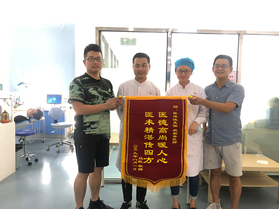 庐阳区门诊部就诊,被诊断为慢性牙周病。经过系统的牙周序列治疗和种植治疗,修复了缺失的牙齿。目前,患者口腔问题已明显好转。为表示感谢,患者特意让其儿子赠送一面写有“医德高尚暖人心,医术精湛传四方”的锦旗。