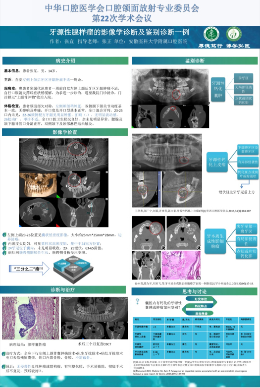 会上,DB电竞放射科团队展示了壁报《牙源性腺样瘤的影像学诊断及鉴别诊断一例》和《多骨性骨纤维异常增殖症一例》。前者展示了较为典型的牙源性腺样瘤,通过其影像学表现、诊断与治疗过程,同具有相似影像表现的牙源性钙化囊肿、牙源性钙化上皮瘤及牙本质生成性影细胞瘤等作出了详细的鉴别诊断说明。后者通过多骨性骨纤维异常增殖症的影像学检查,介绍了骨纤维异常增殖症的不同影像学特征;并与骨囊肿、骨巨细胞瘤、非骨化性纤维瘤等作出了详细的鉴别诊断说明。两幅壁报的展示赢得了与会专家的高度认可和广泛赞誉,分别获得三等奖、优秀奖。